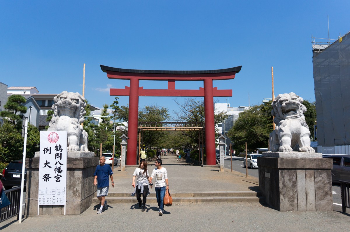 DSC02323 ← Previous Next → The first tori gate along with the komainu protectors on the path to the Tsurugaoka Hachiman-gū shrine