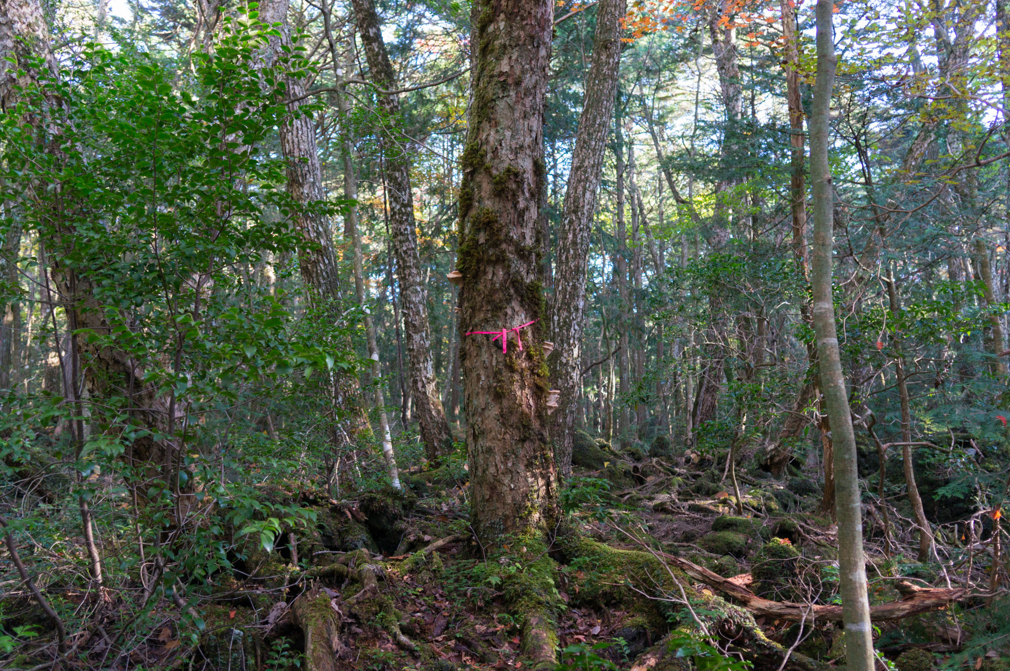 DSC05955 ← Previous Next → Tormented people and Aokigahara explorers tie ribbons to trees next to paths so they can find their way back